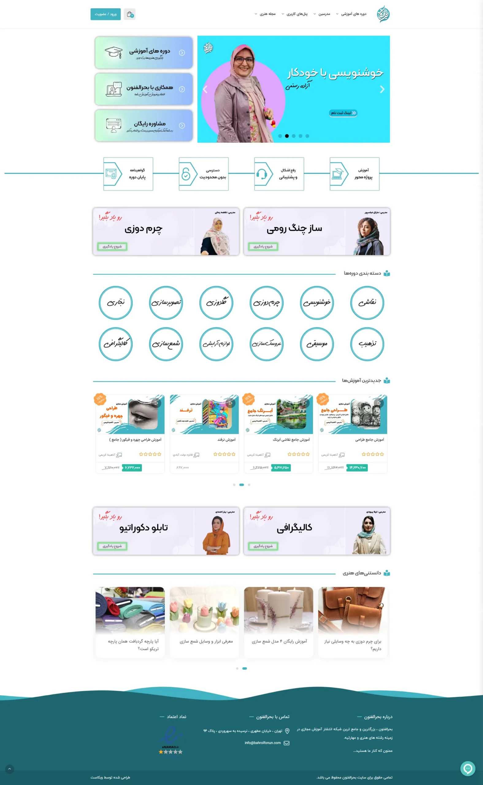 بحرالفنون یک پلتفرم آموزش مجازی است که دورههای متنوع هنری را با همکاری بهترین اساتید ارائه میدهد. کاربران میتوانند به راحتی دورههای دلخواه خود را خریداری کرده و از خدمات آموزشی آنلاین بهرهمند شوند. این پلتفرم امکان ارتباط مستقیم با استاد را فراهم کرده و به کاربران گواهینامه معتبر اعطا میکند.